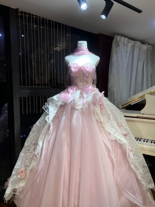 (Includes matching scarf) Romantic Pink Strapless Ruched Tulle Dress with 3D Floral Bead Embellishments Floor-Length Wedding Guest Gown gh7105