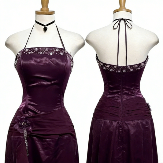 Purple Fashion Elegant Vintage Backless Exquisite Beaded Halter Prom Party Dress Long Satin Formal Evening Dress Ball Gown gh3896