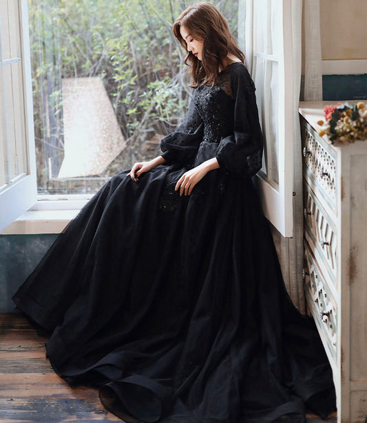 Black Velvet Ruffled Long-Sleeve Floor-Length Gown gh6384
