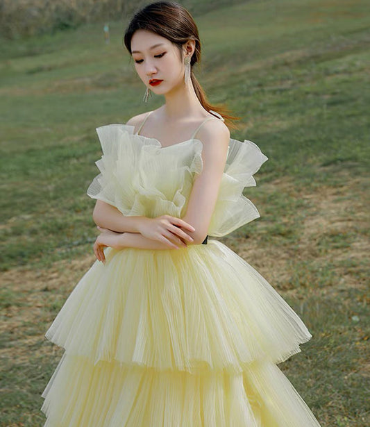 Yellow stylish elegant spaghetti straps long satin tiered ball gown formal evening dress party dress gh3655