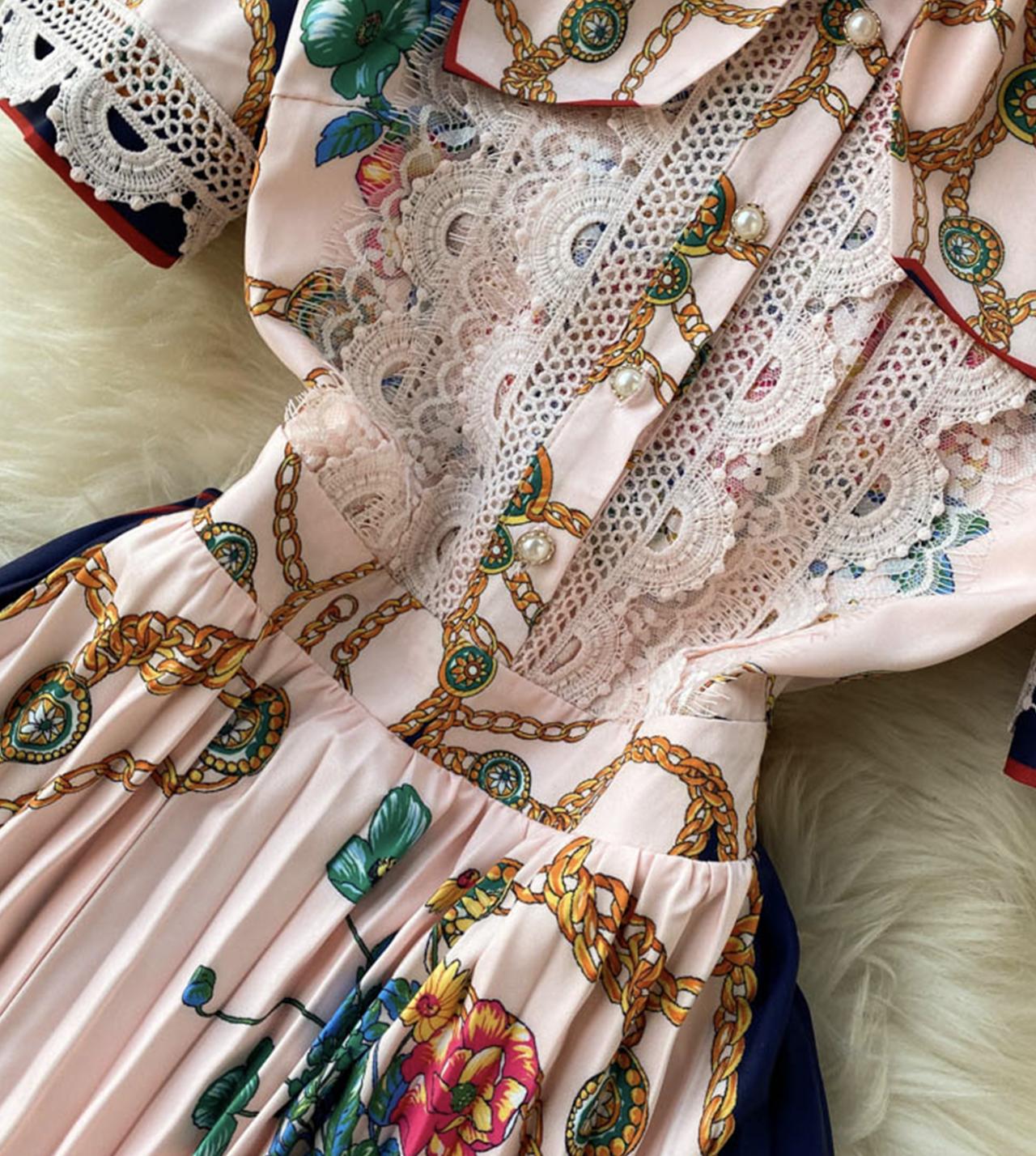 Pink A line floral pattern dress long sleeve dress 795
