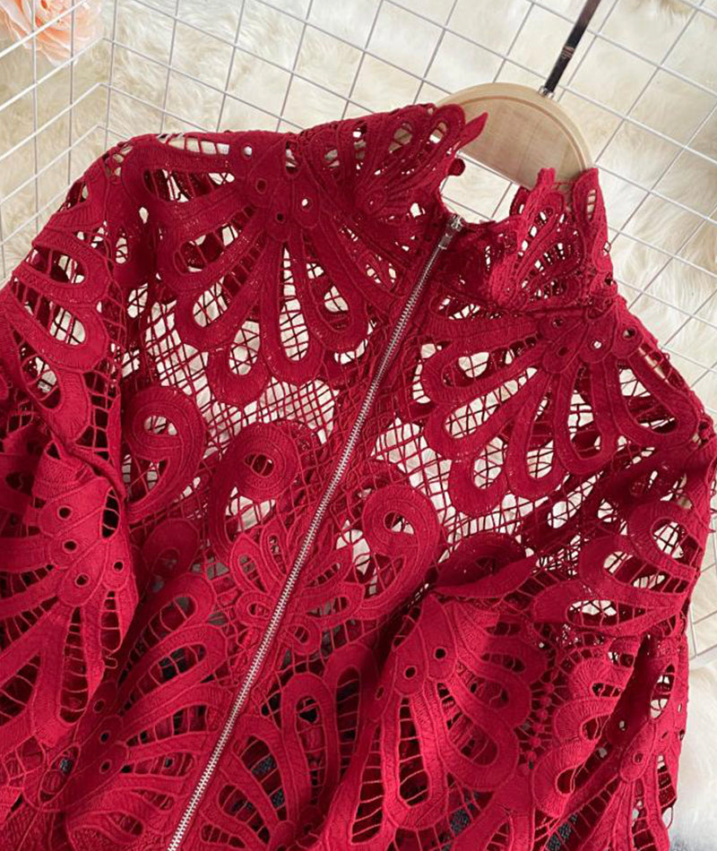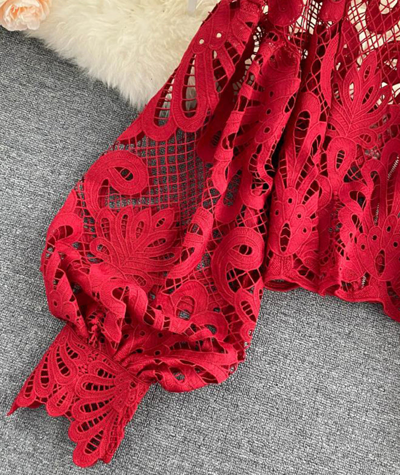 Stylish hollow lace top puff sleeve top 381